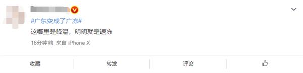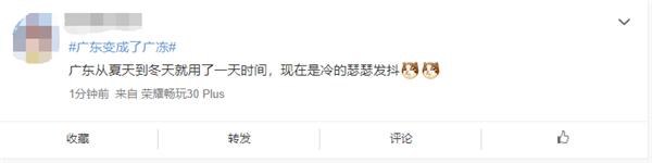 有网友表示:" 广东从夏天到冬天就用了一天时间,现在是冷的瑟瑟发抖 "" 这哪里是降温,明明就是速冻 " 等等。